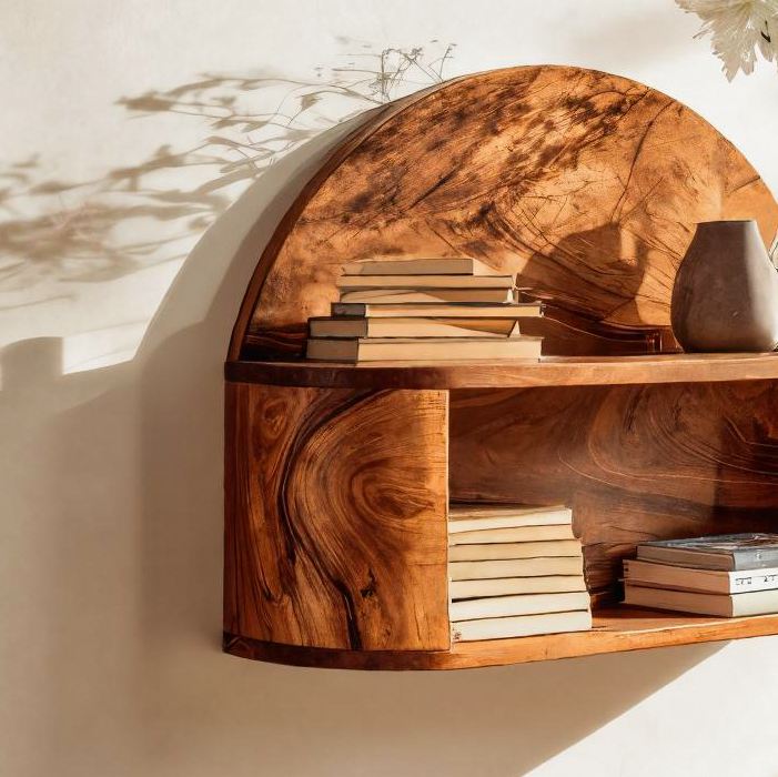 Shaped with a blend of modern artistry and warm natural craftsmanship, the Artistic Statement Shelf serves as both a functional organizer and a sculptural focal point for your home. Its half-round top arcs gently over a spacious lower compartment, creating a balanced composition that draws the eye while offering practical storage. Crafted from richly grained solid wood, this piece casts beautiful shadows and adds quiet sophistication to sunlit entryways, living rooms, and transitional spaces. Whether styled with books, ceramics, or florals, the shelf brings an inviting, gallery-like presence to any wall.