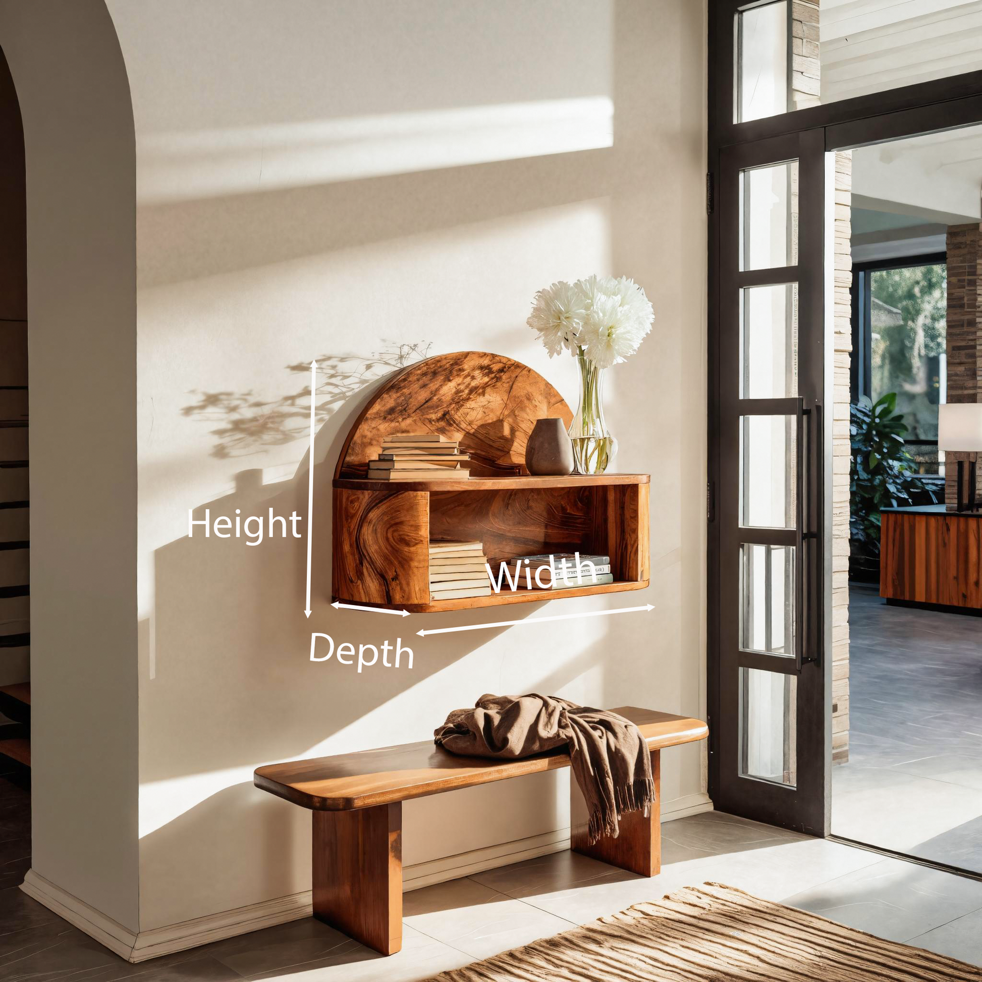 - Versatile Placement: Perfect for entryways as a functional display shelf above a bench, this shelf works beautifully in living rooms to style books, décor, or small plants. It’s ideal for bright wall spaces where sunlight enhances its wood grain and sculptural form.