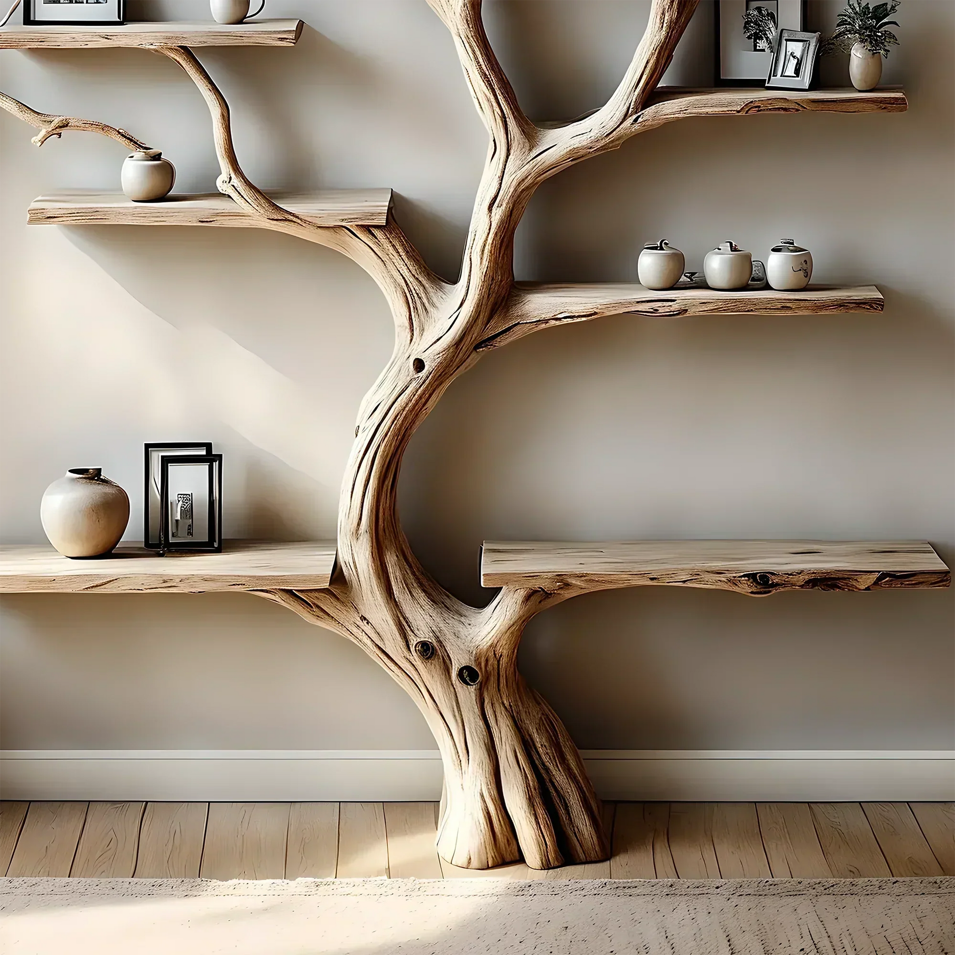 The structure includes multiple floating shelves integrated seamlessly into the branching form. Each tier offers practical storage: from books and framed art to small décor pieces, while maintaining a clean, visually balanced layout.