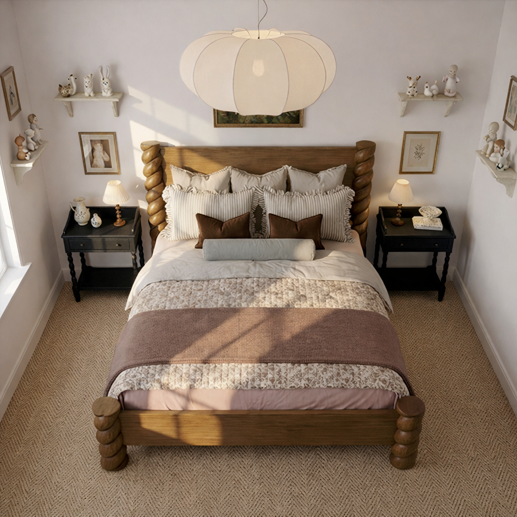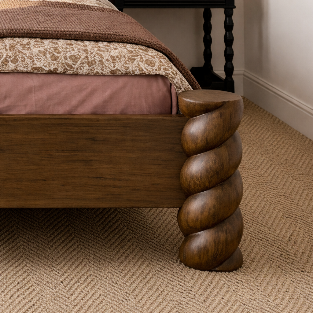 This bed frame features bold twist posts at the headboard and footboard, paired with a smooth wooden panel that highlights the natural wood look. The sturdy frame feels grounded and supportive, while the open under-bed area helps the room stay visually light. With its classic farmhouse silhouette, it pairs beautifully with layered bedding, soft neutrals, and vintage-inspired accents.