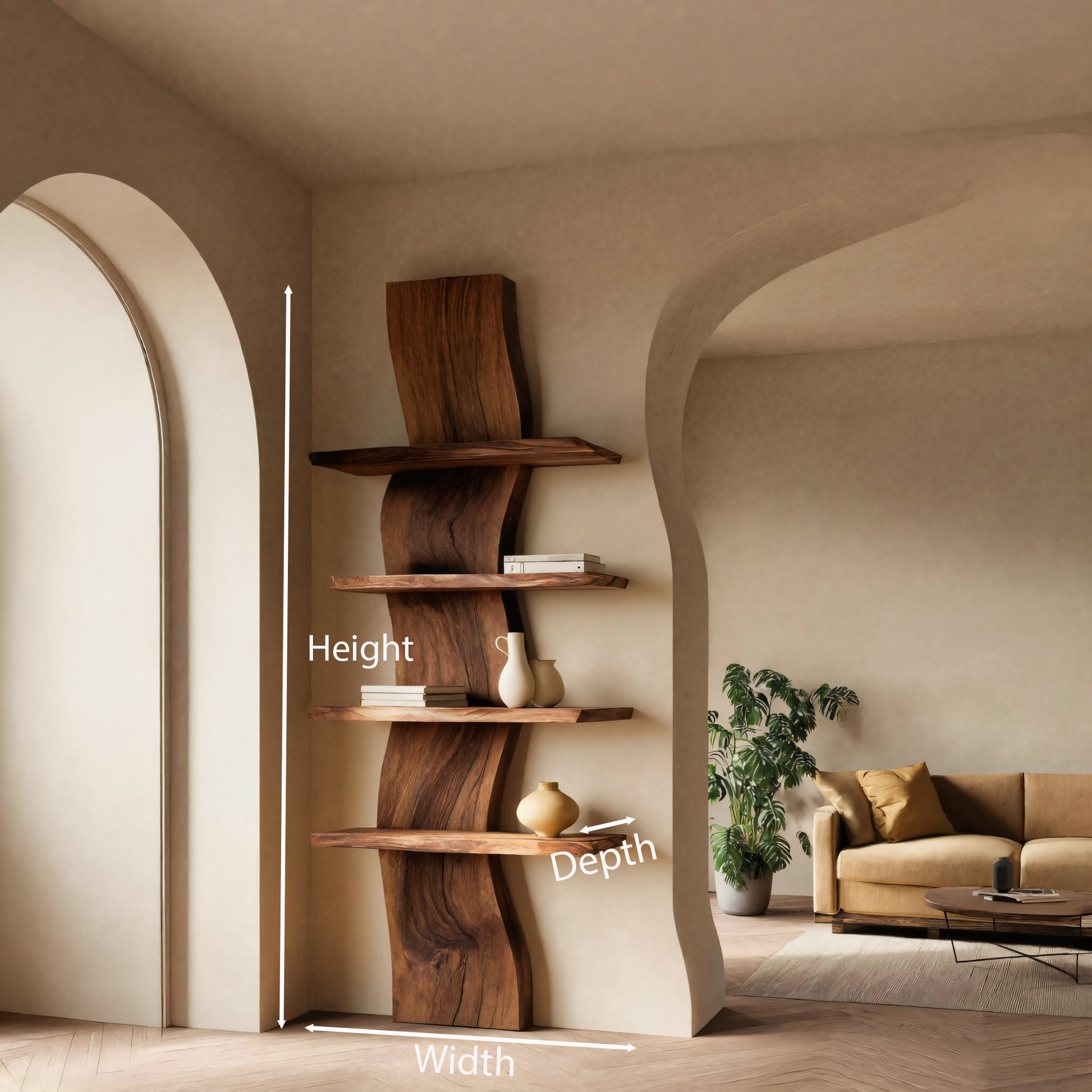Designed as an organic architectural accent, the Handcrafted Curved Floating Shelf brings natural flow and refined craftsmanship into modern interiors. Its tall, wave-shaped wooden spine rises elegantly along the wall, supporting a series of floating shelves that extend outward with effortless balance. Each handcrafted curve highlights the depth and movement of the solid wood grain, making the piece feel like a functional sculpture. Perfect for showcasing décor, books, or ceramics, this shelf transforms living rooms and entryways into warm, artistic, and inviting spaces.