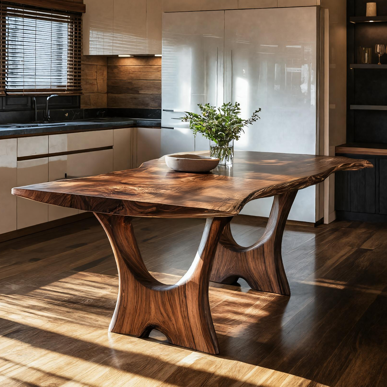 Created to elevate modern living spaces with warmth and character, the Handcrafted Dining Table For Modern Homes showcases a striking solid-wood live edge top paired with sculptural twin pedestal bases. Its flowing curves, organic form, and naturally expressive grain make it a statement piece that feels both artistic and inviting. Perfect for everyday meals or elegant gatherings, this table blends contemporary design with timeless craftsmanship.