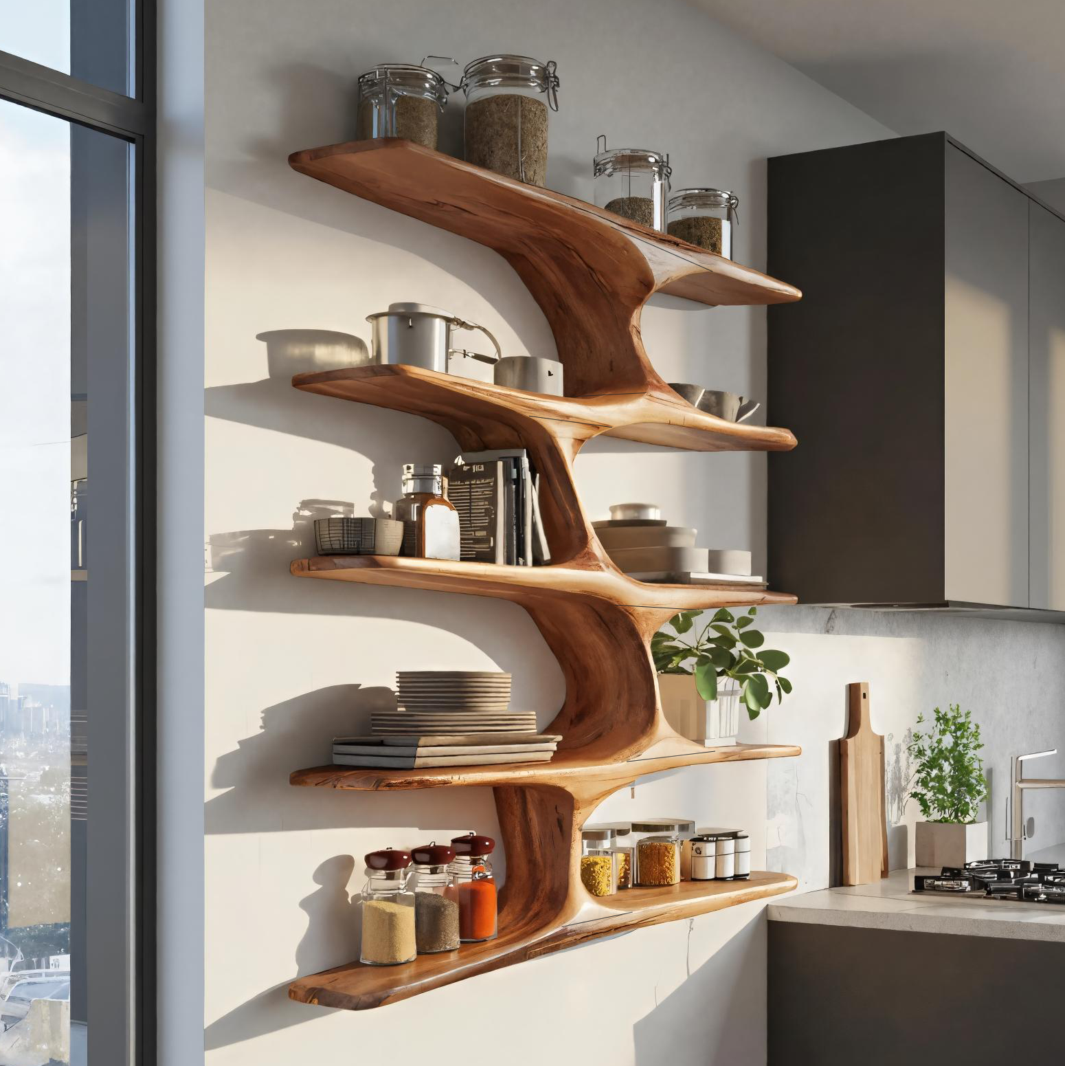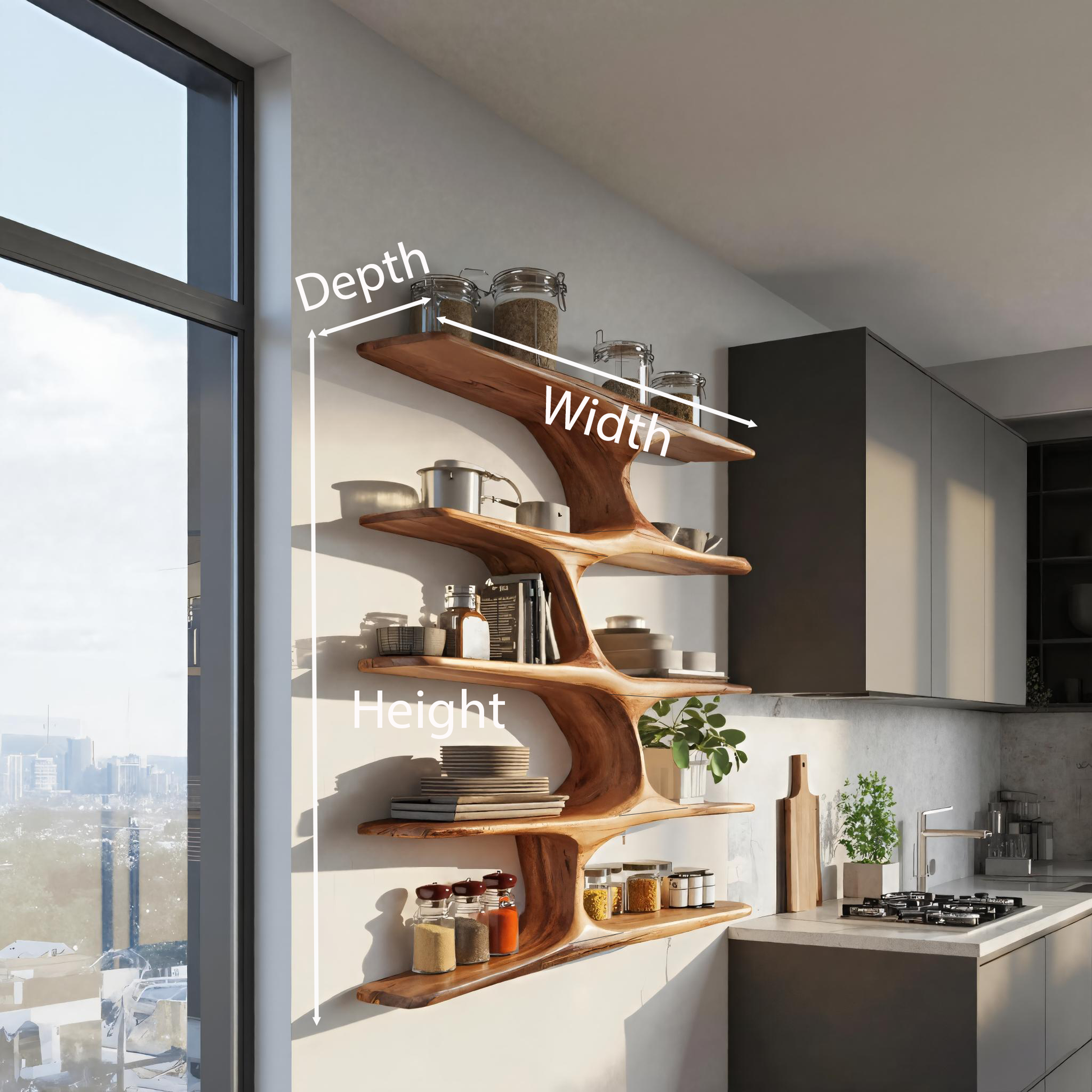 Crafted to celebrate the natural beauty of solid wood, this Handmade Live Edge Wall Shelf For Kitchen adds an organic sculptural presence to your space. Its flowing contours and tiered form create a warm, functional display that enhances both storage and visual interest. Perfect for showcasing pantry jars, daily-use tableware, or decorative kitchen accents, each shelf layer highlights the unique grain and character of the wood.