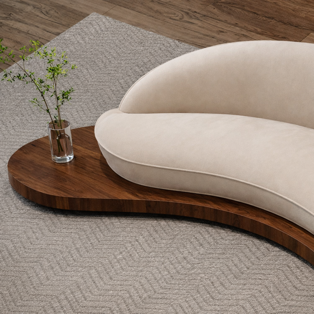 A built-in wood platform base follows the same curved shape, giving the piece a grounded, architectural feel. The low, streamlined form keeps the sofa visually open, helping the room feel spacious and uncluttered.