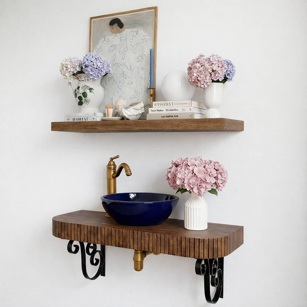 This Modern Wooden Wall Mounted Bathroom Vanity Shelf With Metal Brackets For Bathroom features a thick wooden shelf with a textured edge detail, supported by decorative metal brackets for a balanced, secure look. The open, floating layout keeps the wall feeling light while providing a practical surface for daily essentials. Its simple form pairs easily with minimalist décor, warm lighting, and mixed-material bathrooms.